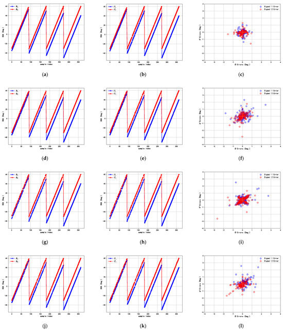 DOA estimation performance of different deep learning methods. (a) Proposed method for . (b) Proposed method for . (c) Estimation errors of proposed method. (d) DCN for . (e) DCN for . (f) Estimation errors of DCN. (g) DNN for . (h) DNN for . (i) Estimation errors of DNN. (j) RDCN for . (k) RDCN for . (l) Estimation errors of RDCN.