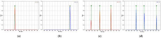 In this section, we verify the generalization performance of the proposed network model, which is trained by using samples generated from two signal sources. The settings for the SNR and the number of snapshots remain the same as those in 6.1. The proposed network model is capable of performing DOA estimation under varying numbers of incident signal sources (). Figure 8a,b display the estimation results for , with incident angles of . Figure 8c,d show the estimation results for , with incident angles of , , and . These results demonstrate that the proposed network model possesses strong generalization capabilities, enabling it to effectively handle more complex signal scenarios.
