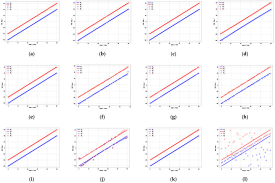where and are the estimated angles for the -th signal in the -th Monte Carlo trial, while and represent the corresponding truth angles. and denote the number of Monte Carlo trials and signals, respectively. The DOA estimation performance is evaluated under varying SNR conditions. Specifically, two equal-power signals are simultaneously incident on the L-array. The incident angle of signal 1, is set to , and the incident angle of signal 2, is set to , where is randomly selected from the range . Monte Carlo simulations (600 trials) are conducted for SNR values ranging from −10 dB to 10 dB, with the number of snapshots .