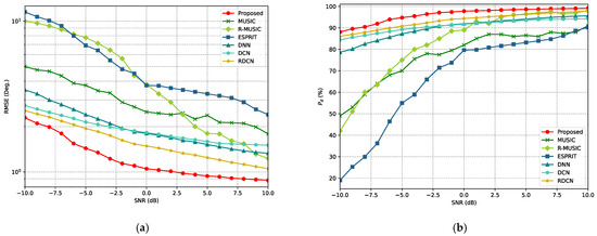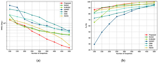 Subsequently, the performance of the proposed method was evaluated under different numbers of snapshots, with the signal angles fixed at and . The SNR was set to 10 dB. For each snapshot configuration, 600 Monte Carlo experiments were conducted. The results are shown in Figure 11. From Figure 11a, it can be observed that the curves of the RMSE for all algorithms decrease when the number of snapshots increases. However, the RMSE curve for the proposed method remains significantly lower than that of the other methods under all snapshot conditions, and its RMSE curve decreases more rapidly with the increase in the number of snapshots. In Figure 11b, the detection accuracy for all algorithms improves as the number of snapshots increases. However, the detection probability for the proposed method exceeds 90% with only 200 to 300 snapshots, far outperforming other methods.