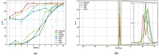 Additionally, we conducted experiments to evaluate the resolution accuracy of the proposed method and compare its ability with other models to resolve adjacent signal sources. Specifically, the first incident angle was fixed at , while the second incident angle varied with an angular offset ranging from to in increments. The SNR was set to 10 dB, and the number of snapshots was fixed at 512 for each sample. For every angular separation , 600 Monte Carlo trials were conducted, and the detection accuracy of each method was computed, as shown in Figure 12a. The results clearly demonstrate that the proposed method significantly outperforms both traditional approaches and other deep learning models in terms of resolution capability. Notably, with an angular separation as small as , the proposed model maintains high accuracy, indicating its superior robustness and feature extraction performance in scenarios involving closely spaced sources.