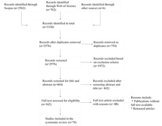 In applying IC 4 (Table 1) to the 3330 articles, 754 studies were removed as duplicates. We observed that the majority of records obtained from the Web of Science search results appeared as duplicates in the Scopus results. We screened the remaining records of 2576 further with exclusion criteria (a)–(e). The outcome of this activity resulted in 604 papers which were screened for title and abstract. The significant decrease in articles was primarily due to limiting publications to our study’s subject areas, focusing specifically on IS integration in the agri-food sector. Excluding systematic literature review papers also played a significant role in reducing the number of articles. The titles and abstracts of the 604 papers were read in Microsoft Excel, after performing the IC 5 and IC 6, 442 studies were excluded. There were 162 papers that qualified for the full text assessment. The full text of the 162 papers were read thoroughly and the selection criteria (IC 5, IC 6, and IC 7) were performed. After applying the selection criteria, 74 papers were selected to be material for the primary study (Figure 2). Then, 88 full text articles were excluded. Some of the publications were excluded with reasons such as full text not available (Table 1).