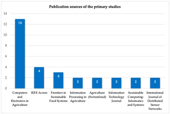 Concerning the publication avenues, we observed that the 74 primary studies were published in 52 different journals. Figure 6 shows the eight journals where more than one paper was published. Moreover, 30 of the papers were published in the top eight journals together, with the remaining 44 published in 44 different journals. Computers and Electronics in Agriculture and IEEE Access seem to be the most preferred journals among researchers in the agri-food and IS integration field.