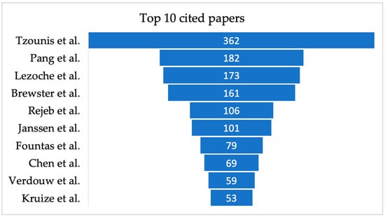 In addition to the above general statistics, the top ten most cited papers are shown in Figure 8. The study of Tzounis et al., which focused on advances and future challenges of integrating IoT such as RFID and other sensors, was observed to be the most cited paper with 362 citations. This was followed by Pang et al.’s publication (182 citations), which proposes a business–IT joint framework for integrating information to create value. Lezoche et al., which surveyed latest digital technologies as well as the integration process across the technologies, was the third most cited paper (173 citations). These papers were followed by studies conducted by Brewster et al., Rejeb et al., and Janssen et al., which have 161, 106, and 101 citations, respectively. The remaining four most cited papers, Fountas et al. and Chen et al., recorded 79 and 69 citations, respectively, while the papers of Verdouw et al. (59 citations) and Kruize et al. had 53 citations (Figure 8).