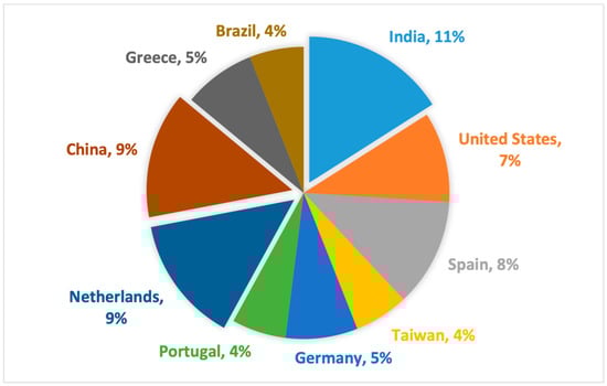 Lastly, we analyzed the geographical distribution of the studies. Figure 9 presents a pie chart illustrating the top ten major contributors to IS integration in the agri-food sector. India, China, and the Netherlands stand out as the leading contributors, with 8 (11%) of the 74 papers originating from India. China and the Netherlands each produced seven studies (9%), followed by Spain and the United States with six (8%) and five (7%) studies, respectively. Germany and Greece contributed four (5%) studies each, while Brazil, Portugal, and Taiwan are in tenth place with three (4%) studies each.