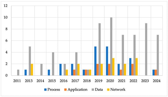 The selected studies were also assessed to identify the different layers at which integration occurs in the agri-food sector. The main integration types such as process, application, data, and network were identified either singly or combined in 70 of the 74 publications from 2011 to 2024. Another type such as domain integration was identified [71]. Four studies [87,89,90,91] did not specify the integration type for the technologies mentioned. In most articles, the focus of the integration is data. Figure 10 shows that data integration occurred frequently in almost all the papers from 2011 to 2024, except for one [92]. This is followed by process and network integration, each accounting for 33% and 23% of the 70 articles, respectively. Application integration was the least discussed topic in the analyzed articles, accounting for only 14% of the 70 papers.
