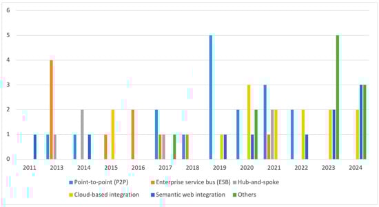 Figure 11 shows that the integration of IS in the agri-food sector is only emerging recently. Before 2017, only a few integration approaches were addressed. In 2011, 2015, and 2016, for instance, semantic web, ESB, and cloud-based were the only approaches discussed by the analyzed studies. This can be a result of less usage of these technologies in these periods as integration of systems often occurs when there is an increase in the application landscape of an enterprise. A similar explanation that might also hold for the few integration approaches in these periods could be attributed to the fact that system integration, even though it was prevalent in other sectors, was still at its infant phase in the agri-food sector. Semantic web methods, though initially mentioned in papers published in 2011, 2014, 2019, and 2020, have shown a notable increase in their application, particularly in recent publications (2022, 2023, and 2024). This could be attributed to their novelty in the agri-food sector.