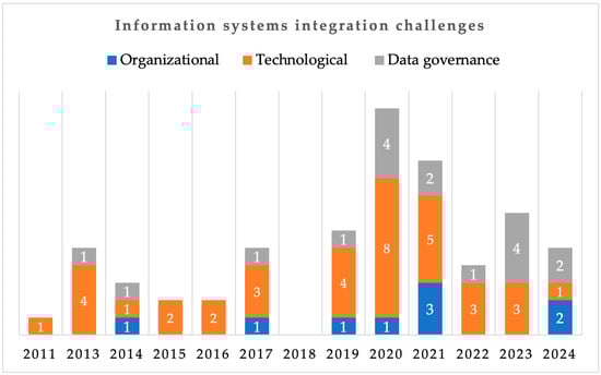 - Integration challenges: Integrating heterogeneous processes, applications, data, and networks to exchange data and coordinate processes presents challenges relevant to the integration process. In this part of the integration aspects, we pinpoint these obstacles that hinder the integration of IS and possible solutions. From the 74 papers analyzed, 27 distinct challenges were identified, encompassing both technical and non-technical issues. These challenges were derived from 46 of the papers (Section 3.7).