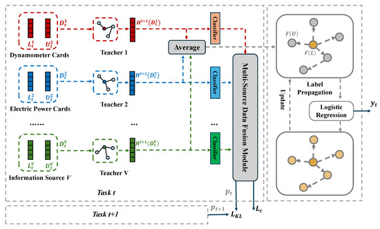 The total loss function for task t is composed of the cross-entropy loss function and the multi-source data distillation loss . The calculation formula for the loss function is shown in Equation (9):