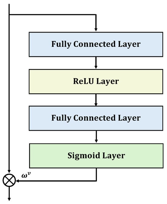 Furthermore, we employ an attention mechanism to dynamically learn the weights of the prediction probabilities from various data source teacher models. By differentially weighting the prediction outcomes of teacher models across different data sources, we achieve an effective integration of multi-source teacher models. Specifically, this paper adapts the Squeeze-and-Excitation attention mechanism to develop a module for the fusion of multi-source feature representations. This module consists of a sequence: Fully Connected Layer, ReLU activation layer, another Fully Connected Layer, and Sigmoid activation layer, as depicted in Figure 2. The prediction probability output by the teacher model for the v-th data source branch is represented as , with its corresponding attention score denoted by , as defined in Equation (4):