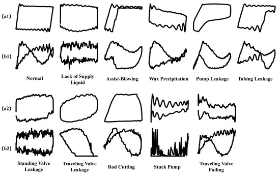 Dataset examples. (a1,a2) Measured ground dynamometer cards, (b1,b2) Measured electrical power cards.