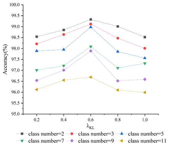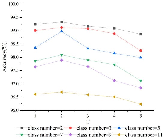 The temperature coefficient T controls the softening of output probabilities, which significantly impacts the effectiveness of knowledge transfer. To determine the optimal setting for our model, we tested various values of T. Figure 5 presents the model’s recognition accuracy across different temperature coefficient settings. Our results indicate that setting T to 2 provides the best balance between the smoothness of the output and the preservation of critical features from the multi-source data. This optimal value ensures that the model maintains high accuracy while effectively transferring knowledge across different tasks.