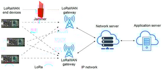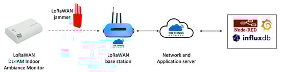 - Perkovic, T.; Siriscevic, D. Low-Cost LoRaWAN Jammer. In Proceedings of the 2020 5th International Conference on Smart and Sustainable Technologies (SpliTech), Virtual, 23–26 September 2020; IEEE: Piscataway, NJ, USA, 2020; pp. 1–6. [Google Scholar] [CrossRef]