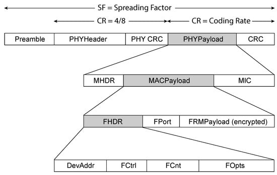 A LoRaWAN packet is structured to ensure reliable and efficient communication between end devices and the network infrastructure. It begins with the physical layer, which includes a preamble for synchronization, a header with metadata, and CRC fields for error detection. The packet also contains a MAC layer, which includes a MAC header (MHDR), a payload (MACPayload), and a Message Integrity Code (MIC) to ensure security. The MACPayload itself is further divided into components such as the Frame Header (FHDR), which provides routing information, the application port (FPort), and the encrypted data payload (FRMPayload), as shown in Figure 2. This structured format allows for secure, error-free communication while facilitating proper routing and device identification [41].
