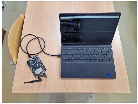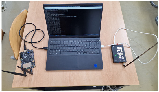 Figure 4. Scenario I setup. - Scenario II—bladeRF as both receiver and transmitter:In this scenario, only two devices are used: the bladeRF and a host device (PC), as illustrated in Figure 5 and shown in Figure 6. The bladeRF SDR operates as both a receiver and a transmitter, monitoring all channels in the EU LoReWAN spectrum. The captured signals are processed on the host device, where the relevant parameters are extracted. Once a target signal is detected, the bladeRF itself transmits the corresponding jamming packets on the detected frequency and SF, eliminating the need for a separate transmitter. This setup ensures a streamlined approach to signal acquisition and jamming within a single device. This scenario was designed to test the hypothesis that a single-device setup could lead to a faster jamming response. We anticipated that the advantages would include lower reaction time by eliminating the need for inter-device communication, improved synchronization by having both reception and transmission within the same SDR, and more efficient jamming due to reduced hardware switching time. However, we also anticipated disadvantages, including a higher processing load on the bladeRF, potentially introducing processing bottlenecks, limited flexibility for experimental variations requiring separate spatial positioning of the receiver and transmitter, and potential RF performance issues due to full-duplex operation in a single SDR.