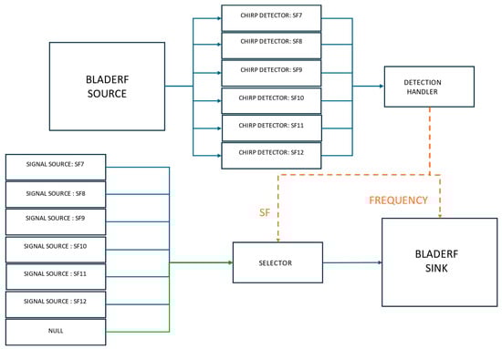 - SoftwareThe software implementation of the system was developed using GNU Radio, a powerful open-source software toolkit for building software-defined radios. GNU Radio enabled the modular design of the signal processing flowgraph, allowing seamless integration of various blocks for real-time detection and analysis of LoRaWAN signals. GNU Radio was chosen for its open-source flexibility, allowing real-time signal processing without requiring expensive proprietary tools. In addition, it offers extensive libraries and preexisting modulation/demodulation blocks for LoRa technology, simplifying implementation. It also provides seamless SDR integration with direct support for bladeRF and HackRF One devices.A critical component of the setup was the ChirpDetector block, sourced from the gr-LibreLoRa library (https://gitlab.com/jpsimas/librelora, accessed on 1 March 2025). This block was instrumental in identifying LoRa chirps using their unique modulation characteristics, facilitating the extraction of parameters such as spread factor, bandwidth, and normalized frequency. The combination of GNU Radio’s flexibility and the specialized capabilities of the ChirpDetector block ensured efficient and accurate signal processing.
