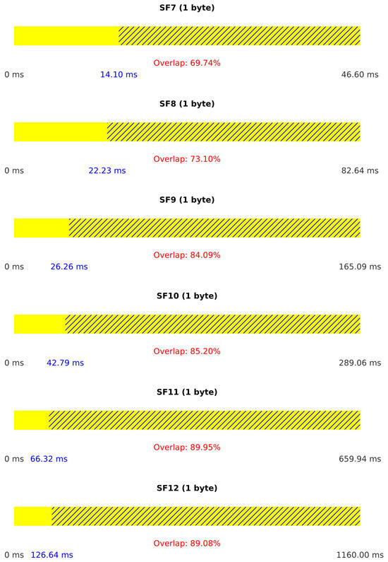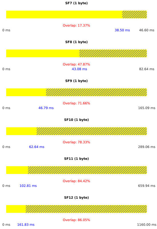 These findings highlight the inherent vulnerabilities of LoRaWANs when confronted with reactive jamming, particularly given LoRaWANs’ reliance on unlicensed ISM frequency bands and their use of ALOHA-based medium access without robust collision-avoidance mechanisms. Even partial overlap of legitimate and jamming signals was sufficient to prevent successful reception, underscoring the critical nature of precise timing and frequency alignment in attack execution.