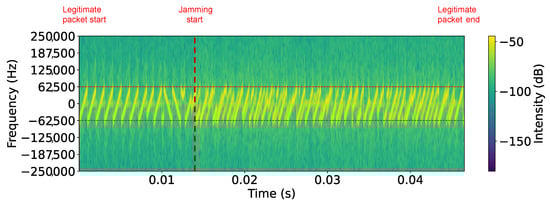 Moreover, LoRaWAN-specific jamming techniques exploit the unique characteristics of LoRa technology’s chirp spread spectrum modulation. Studies have shown that synchronized jamming can effectively disrupt LoRa communications by overwhelming the gateway with noise, leading to a dramatic decrease in network throughput [25,26]. The inherent design of LoRaWANs, which prioritizes long-range communication over robustness against interference, further exacerbates their vulnerability to such attacks [24,27].