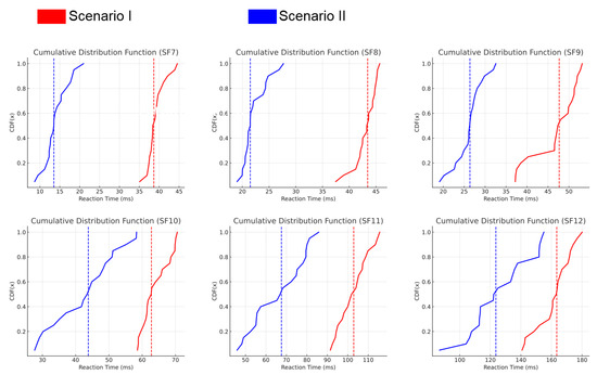 For each SF, we transmitted and jammed 100 packets in varying payload sizes, and the PLR was measured for each condition. Reaction times were analyzed using the CDF to observe variations between trials. This approach ensured that our conclusions were robust, repeatable, and statistically valid. Although the mean reaction time was used for a general comparison between Scenario I and Scenario II, we relied on CDFs to visualize the probability of the jammer reacting within a specific time, clarifying reaction time differences across spreading factors. The transmitter, receiver, and gateway were kept at a fixed distance to ensure that distance was not a factor in the results, and attention remained focused on synchronization rather than signal power.