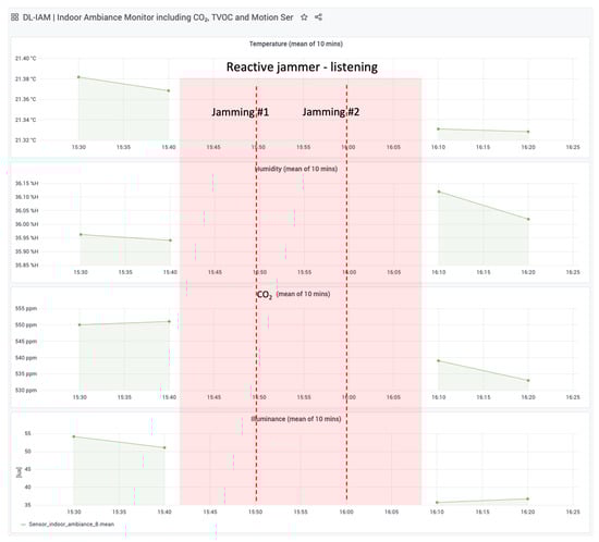 - Environmental Parameters: Temperature, humidity, CO2 levels, and illuminance readings show continuity before and after the jamming period, demonstrating normal sensor operation outside the attack window.