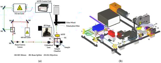 Figure 2 shows the schematic and the 3D illustration of the experimental setup used for the multi-modal light sheet microscopy. Figure 2a depicts the optical path for both 532 nm and 660 nm lasers. The laser beams are directed through mirrors (M1-M5) and a beam splitter (BS) to focus the light onto the sample using a cylindrical lens. The system is equipped with a 4D stage for precise sample movement and a camera to capture the images. The Acousto-Optic Tunable Filter (AOTF) is used for wavelength selection, while a polarization filter and filter wheel help manage light interference and background. Figure 2b shows a detailed 3D rendering of the setup, highlighting key components, such as the lasers, optical elements, and the sample chamber. The CAD model was manually adjusted for clearer visualization and may not reflect the exact physical positions of components used in the experimental setup. The diagram helps visualize the complex optical arrangement and how the system enables the simultaneous collection of multiple imaging modalities (Raman, Rayleigh, and fluorescence), supporting comprehensive analysis of biological samples with high precision. This is achieved through rapid, sequential switching between modalities enabled by the AOTF, eliminating the need for physical realignment and preserving spatial calibration across datasets. Also, a detailed explanation of the system components is stated in Table 1, and their role in image acquisition can be found in the subsequent Section 2.1.