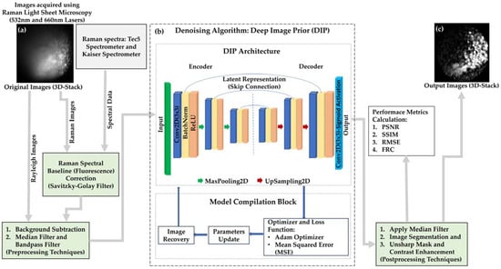 To complement the DIP framework, a systematic pre- and post-processing pipeline was applied to improve image quality while preserving structural fidelity. Background subtraction was performed using a reference image to normalize intensity profiles. Additive and subtractive Gaussian noise was introduced to generate corrupted pairs, facilitating the network’s learning of robust, noise-resistant features. Median filtering helped suppress high-frequency noise without blurring structural details. A circular region of interest (ROI), defined using skimage’s disk function, localized analysis to biologically relevant areas while minimizing edge artifacts. Adaptive histogram equalization improved local contrast within the ROI, and morphological operations such as dilation and erosion were employed to refine small structures. These steps were optimized to align with DIP’s self-regularizing nature, enhancing its ability to produce clean and structurally accurate reconstructions. DIP denoising was applied on a per-slice basis for volumetric Raman imaging, ensuring localized enhancement while preserving axial continuity. Its self-regularizing nature inherently suppresses acquisition-induced noise while maintaining structural fidelity. To prevent overfitting to noise, early stopping criteria were implemented, and performance was validated using PSNR, SSIM, and RMSE metrics. Unlike traditional methods, DIP does not require external training data, instead relying on the internal image statistics captured by the CNN architecture. This makes it particularly effective for Raman light sheet microscopy, where artifacts from diffraction and non-uniform illumination can degrade image quality.