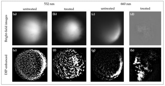Raman bright-field images for treated and untreated samples using 532 nm and 660 nm lasers. At 532 nm untreated (a), treated (b), and at 660 nm untreated (c), treated (d). DIP-enhanced Raman intensity maps at 532 nm untreated (e), treated (f), and at 660 nm untreated (g), treated (h). (Note: The displayed image regions are cropped from the original 635 µm × 635 µm field of view for clarity).