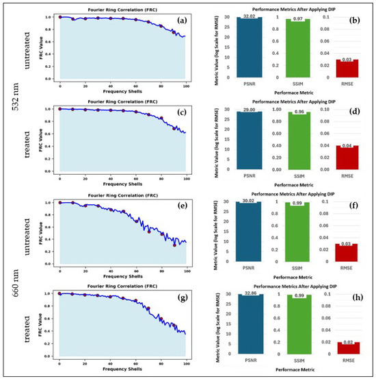 Quantitative evaluation of DIP performance at 532 nm, untreated using FRC metrics (a), PSNR, RMSE, SSIM (b), and treated FRC metrics (c), PSNR, RMSE, SSIM (d). Quantitative evaluation of DIP performance at 660 nm, untreated using FRC metrics (e), PSNR, RMSE, SSIM (f), and treated FRC metrics (g), PSNR, RMSE, SSIM (h).