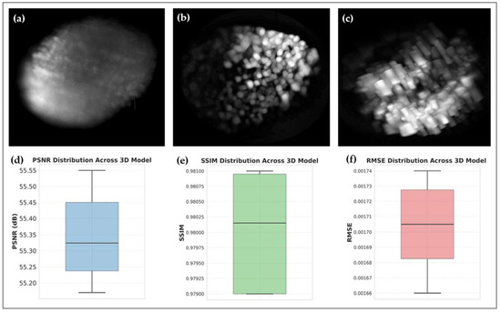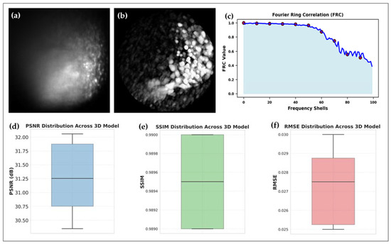 To further quantify fluorescence suppression, PSNR, SSIM, RMSE, and FRC were computed across all 41 slices (Figure 8c–e): FRC (Figure 8c): The FRC analysis confirms a clear enhancement in spatial resolution, validating the improved fidelity of 3D Raman light sheet reconstructions. PSNR (Figure 8d): The increase in PSNR values confirms that fluorescence artifacts have been suppressed, improving overall signal clarity. SSIM (Figure 8d): The structural similarity metric demonstrates that molecular details are preserved while fluorescence background is minimized. RMSE (Figure 8e): A reduction in RMSE indicates improved pixel-wise accuracy, ensuring precise molecular reconstructions.