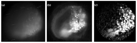 This section presents the original images captured directly from the measurement setup, highlighting the system’s capability to acquire Raman, Rayleigh, and fluorescence images. While Raman imaging remains the primary focus, the system also enables Rayleigh and fluorescence imaging, providing additional structural and viability information. Rayleigh images reveal variations in scattering intensity, correlating with Raman-identified necrotic zones, suggesting extracellular matrix degradation. An example of this multi-modal capability is shown in Figure 10, where Figure 10a presents a fluorescence image of a treated UM-SCC-14C spheroid, highlighting metabolic activity and structural integrity, while its corresponding Rayleigh image at 660 nm with 1 mW laser power reveals scattering-based morphological contrast. These unprocessed images provide direct insights into the optical properties of the sample, supporting the interpretation of Raman spectra and biochemical distributions. The integration of Raman, Rayleigh, and fluorescence imaging within a single experimental framework ensures a comprehensive analysis of structural and molecular alterations in 3D spheroids. The ability to capture high-resolution, artifact-free images directly from the setup establishes a robust platform for studying therapeutic effects and advancing cancer research methodologies.