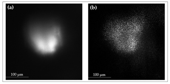 (a) Fluorescence image of 14C treated sample using 660 nm excitation laser at 15 mW power and AOTF at 694 nm; (b) Corresponding Rayleigh image of same 14C treated sample using 660 nm excitation laser at 1 mW power and AOTF at 650 nm.