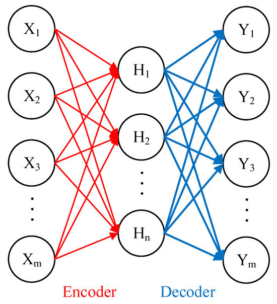 The network topology for the standard autoencoder (AE) model consists of the three-layer neural network as shown in Figure 1. Additionally, both the input and output layers contain the same number of neurons. The transformation of the input vector to the hidden layer feature output is the encoding process of the AE model, while the decoding process is the transformation of the hidden layer feature output to the output layer. The training of the AE model focuses on minimizing the loss function with the goal of reconstructing the input data from the output data. Hidden layer features can be used as input data reconstruction and deep feature expression. The inclusion of the sparsity term in the loss function employed in training the AE model leads to the creation of the sparse AE model, so that the output of hidden layer features has sparsity. The sparse AE model can learn abstract features and structure of the input data more effectively with the mathematical calculation formula of the training process defined as follows: