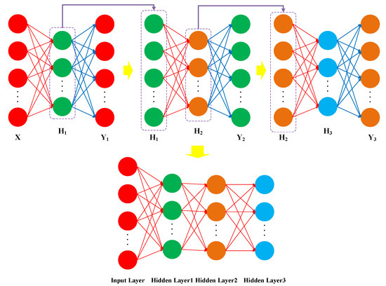 The step-by-step training and stacking of hidden layers from multiple sparse AE models ultimately construct the SSAE model. The network structure and training process of SSAE model are exhibited in Figure 2. Upon completing the training process with the minimum loss function, the hidden layer outputs that reflect the reconstructed input data features are generated from the first sparse AE model, which are subsequently fed as the input vector to the second sparse AE model for training in the same manner. After the sequential training of multiple sparse AE models, the encoder connection weights of each sparse AE model are applied as the connection weight between the two neural network layers corresponding to the SSAE model. After training the SSAE model, the original input signal features are mapped to the output representations from the top hidden layer to achieve deep feature learning. Finally, the multi-layer neural network-based SSAE model is constructed.