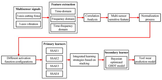Deep learning method can learn deeper feature information from monitoring sensor signals with more powerful feature learning ability as opposed to shallow machine learning models, which makes it an important research field to improve the indirect monitoring accuracy of tool condition. Multi-sensor signal fusion technology can provide more abundant and comprehensive tool condition monitoring information to improve the monitoring effect. SSAE as an unsupervised deep learning model performed deep fusion feature learning on input multi-sensor signals with BPNN as the regression layer. The three-axial cutting force and vibration signals monitored online in milling tool wear experiment were extracted and optimized in time, frequency, and wavelet domains, respectively. The combinations of sensitive features selected by correlation analysis were normalized and put into the SSAE-BPNN model, thereby constructing the deep neural network prediction model for tool wear. The SSAE model can construct tool wear prediction models with different prediction performance through different activation function configurations of hidden layers. The intergrated deep learning model with stacking learning strategy used the multiple single SSAE models with different prediction performance as the primary learners with the hyperparameter optimized GBDT regression model as the secondary learner. Finally, the construction and calculation processes of the proposed model with multi-sensor signals input and ensemble learning strategy are shown in Figure 3.