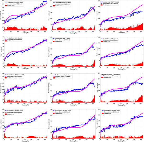 The predicted wear of the comparative prediction models for each datasets.
