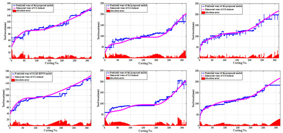 The PHM 2010 datasets recorded the three-axial cutting force, three-axial vibration, and acoustic emission signals in the milling wear experiment. Six three-flute ball nose tungsten carbide cutters were subjected to wear experiments with each cutter executing approximately 315 cutting cycles under the same working conditions mentioned above with collected datasets named C1–C6 in turn. LEICA MZ12 high-performance stereomicroscope (Wetzlar, Germany) was used for offline measurement of the microscopic wear status of the three cutting blades on the milling cutter after the end of each face milling cycle. The wear measurement labels for multi-sensor monitoring signals were collected after each cutting cycle for the C1, C4, and C6 datasets. Simultaneously, these three datasets were selected as experimental datasets to verify the tool wear prediction performance of the proposed model in this paper.