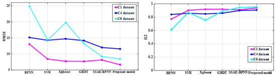 The proposed method applied deep learning models with different predictive performance as the primary learner. The hidden layer activation function of the SSAE model directly affected its feature learning ability and tool wear prediction performance. Sigmoid, hard_sigmoid, tanh, softsign, and sin activation functions were used for SSAE model training with the same optimal hyperparameter configuration for tool wear prediction, respectively. Considering that the output values of these functions fall within the range of −1 to 1 or 0 to 1, this ensured that the hidden layer outputs of the AE model remained within the same range as the input data combined with the construction process of the SSAE model and the normalization of the input data, which allowed the SSAE model to be trained layer-by-layer and perform deep feature extraction. The root mean square error (RMSE) of the predictive wear is listed in the Table 3 with C1 and C4 datasets as the training samples and C6 dataset as the test samples. The SSAE models configured with sigmoid, hard_sigmoid, softsign, and tanh activation functions were selected as the primary learners of the proposed model. Principal component analysis (PCA) was applied to compress and perform dimensionality reduction on the selected sensitive features. The BPNN, SVR, Xgboost, and GBDT regression models with the first five principal components as input and Bayesian optimization hyperparameters were established for predicting the changes in the wear of milling tool as comparative prediction models. The predicted wear of the above four constructed prediction models for the three datasets as test set are shown in Figure 5 with the model parameter configuration listed in Table 4. The GBDT regression model with Bayesian optimization hyperparameters showed better predictive performance compared to other shallow machine learning regression models, which was utilized as the secondary learner of the proposed model. Four primary learners divided the training set and testing set at 1:1 ratio and used the stacking learning strategy for ensemble learning to create the new sample datasets for training the secondary learners, when two datasets were chosen as the training sets with the leftover dataset used for testing from C1, C4, and C6. The predicted wear of the proposed method and single SSAE-BPNN model with sigmoid as the activation function is shown in Figure 6. The optimal hyperparameter configurations of the GBDT model for predicting the C1, C4, and C6 datasets are listed in Table 5. RMSE and determination coefficient (R2) were calculated as evaluation indexes for the performance of predicting tool wear. The calculated evaluation index values of the proposed method and above five comparative predictive models are presented in Table 6 and the comparison effect is shown in Figure 7.