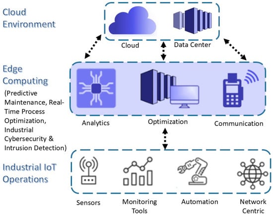 Edge computing is an important part of the IIoT since it optimizes the performance, dependability, and quickness of industrial processes [9,23]. It involves working with information nearer to where it is created; for instance, in the sensors and machines instead of going to massive cloud information hubs [24,25]. IIoT ecosystems produce huge amounts of data from sensors and other devices in the system. Relaying all this information to a central cloud may cause network bandwidth issues and, subsequently, high latency. Edge computing relieves this problem by processing and filtering a lot of data at the edge without sending raw data to the cloud. This maximizes the utilization of bandwidth and puts less strain on the supporting structures in the network. Edge computing enables the expansion of IIoT systems by the incorporation of more edge devices and sensors at the edge without overloading the central cloud. Such decentralization also opens more opportunities for more efficient and adaptable industrial setups, as more processing and storage resources can be deployed at different locations [9,26,27,28].