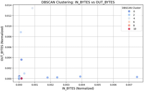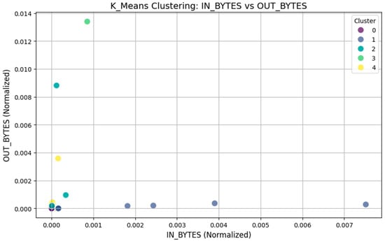 To determine the performance of the clustering, the silhouette score was used as a measure of clustering quality in order to know how well the clusters were separated. From this, a score of 0.612 was obtained, which is good for clustering quality since the clusters are well-separated. Figure 3 shows a graphical representation of the clustering solution based on the analysis of the “IN_BYTES” and “OUT_BYTES” instances normalized for analysis. Different colors have been used to represent various clusters. The x-axis plot shows that some of the clusters are spread more widely, which may imply different traffic densities or traffic patterns, while other clusters are found to be as near to zero as possible, which could imply normal traffic or a lack of traffic in the network. This analysis is important in identifying patterns that may be indicative of anomalous traffic behavior and, hence, improve security and optimization in industrial IoT systems.