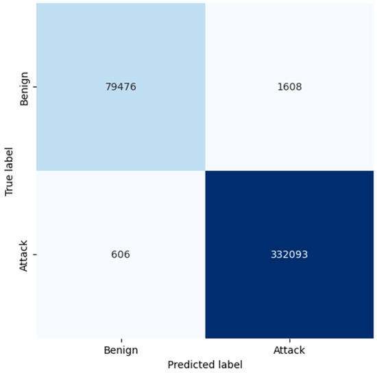 The confusion matrices of KNN, RF, and LR, as shown in Figure 5, Figure 6 and Figure 7, present the analysis results of the classification models on the identification of benign and malicious traffic. For KNN, the confusion matrix depicts that the model has successfully classified benign traffic with 79,476 TP and 1608 FP. This leads to an accuracy of 98% and a specificity of 99% for benign instances, which show that KNN is accurate enough in identifying benign traffic. However, for the attack detection, the model has a moderate number of false negatives (606), which means that some of the attacks were not detected at all, which may be an issue in critical applications where all possible threats have to be flagged.