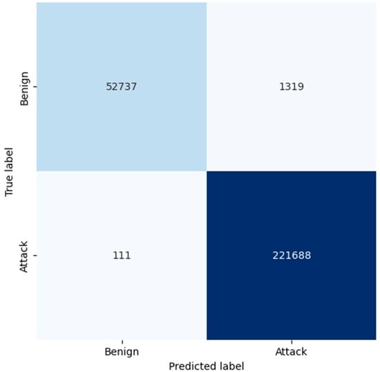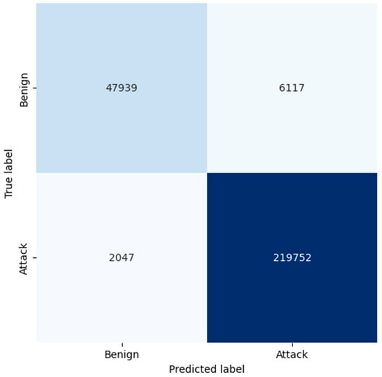 The confusion matrix of RF proves that the model has good accuracy in general. For benign traffic, the true positives are at 52,737, while the false positives are at 1319, resulting in a high level of precision of 0.98 for benign classification through RF. Even more critical, in the case of attack detection, RF has a small number of false negatives equal to 111, so the recall of the algorithm is 1.00. As demonstrated, this makes RF more reliable in detecting attacks with low false negative rates and in accurately categorizing legitimate traffic. From the confusion matrix, the LR model identifies the attacks reasonably well, while four times more false positives are recorded from the benign traffic when compared to both KNN and RF. The model found 47,939 true positives for benign traffic and 6117 false positives; this means it requires more time to analyze, thus giving a lower precision of 0.92. Moreover, it made 2047 false negatives to attacks, and this affected its recall in providing complete details of all possible threats. The larger ratio of false positive cases makes one believe that LR might be classifying benign traffic as malicious more often than it should, which might be disastrous, especially in environments where minimizing false alarms is important.