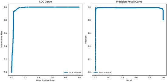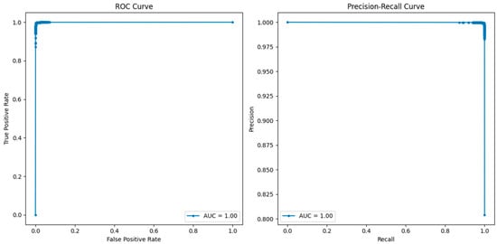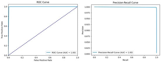 The comparative analysis of the ROC and precision–recall curves, as shown in Figure 8, Figure 9 and Figure 10, gives a detailed insight into the results of the KNN, RF, and LR models. In the case of KNN, the optimum results can be observed from the ROC as well as the precision–recall curves, where the obtained values of both curves are equal to one. The ROC curve of true positive and false positive rates gives us an insight that KNN has a sensitivity and specificity of 100% at different thresholds, meaning that KNN does not produce any false positives or false negatives in the classification of benign and malicious traffic. The precision–recall curve also depicts the value of 1.00, which also confirms that KNN has the perfect value of precision and recall. This seems to imply that KNN is very efficient in differentiating between benign and attack instances with no degradation in its capability. In terms of both the ROC and precision–recall curve, RF also showed the best result of one. The results of the ROC suggest that, for RF, there is a perfect distinction between benign traffic and attack traffic and that, even at a high TPR, the FP rate is very low.