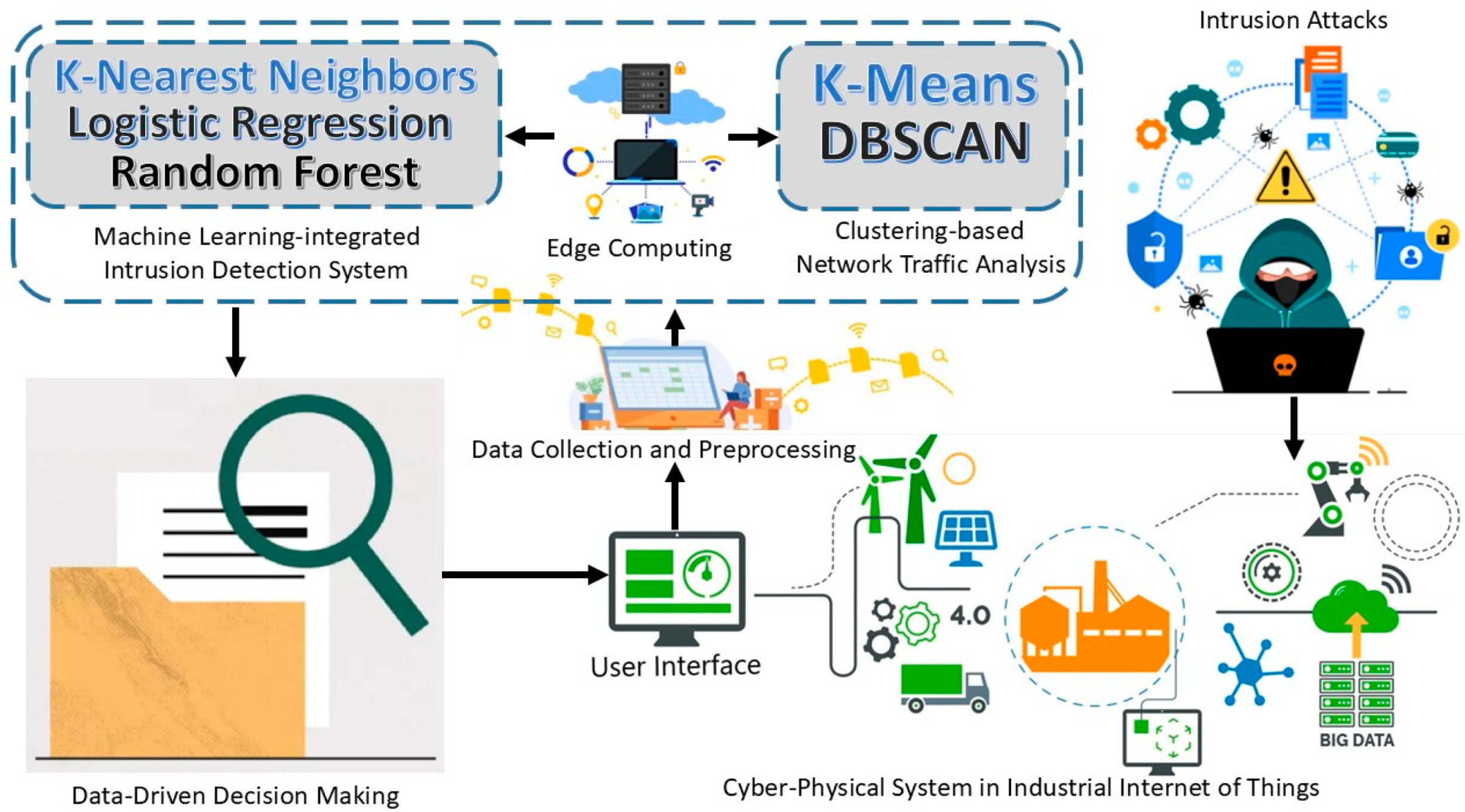 Security is one of the main issues of the IIoT, where the protection of cyber–physical systems becomes challenging due to the complexity and connectivity [29]. Since IIoT systems pull together increased numbers of sensors, devices, and communication networks, the exposure to cyber threats also increases, and, thus, it calls for effective security. The more complex these networks become and the faster they grow, the harder it is for traditional security solutions to protect these systems, which is why new approaches are needed in this sector. The advanced usage of edge computing can provide a solution to these security issues. Edge computing means that the data processing is performed nearer to the source, which involves IoT devices and sensors, unlike depending on a centralized cloud platform [30]. This approach not only saves time and bandwidth but also increases the ability to analyze information and make decisions in real time. If edge computing nodes are integrated into the IIoT network, traffic can be analyzed, and, potentially, threats are detected in real time, which makes the response time faster [31,32,33]. Another aspect addressed in improving security in IIoT systems is based on including extended traffic analysis and intrusion detection methods [2]. Clustering traffic data can be applied to analyze normal and even detect abnormal traffic flow by collecting similar datasets, which is beneficial for filtering out legitimate and illegitimate traffic. When coupled with IDSs such as k-nearest neighbors (KNN) [34,35,36], random forest (RF) [34,37,38], and logistic regression (LR) [34,36,39,40], potential intrusions can be identified and classified correctly using the observed traffic pattern.