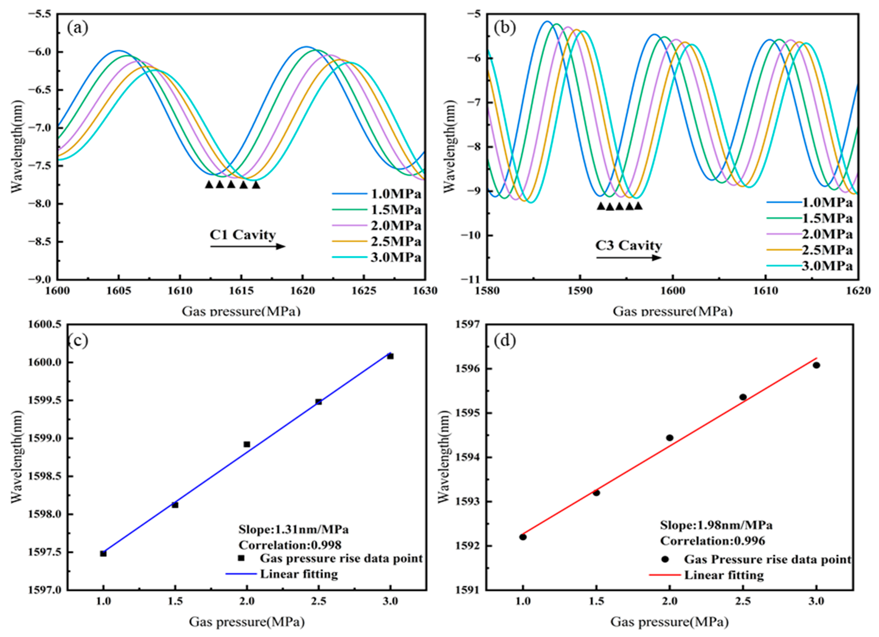 The separated spectra of cavities C1 and C3 of Sensor 1 as they vary with gas pressure are shown in Figure 6a,b. As the gas pressure increases, the spectra of both C1 and C3 cavities shift towards longer wavelengths. The linear fitting of the gas pressure responses of cavities C1 and C3 of Sensor 1, as shown in Figure 6c,d, results in gas pressure sensitivities of 14.41 nm/MPa for C1 and 10.1 nm/MPa for C3.