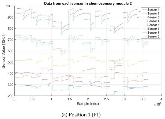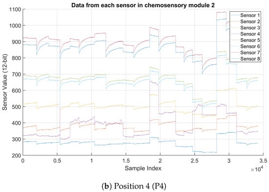 - Behavior Across All Sensors: Figure 2 shows data collected in the chemosensory module 2 at two different positions (P1 and P4) from eight sensors, each tracking a distinct signal. The general trends in both graphs are similar, suggesting that the gas exposure events at P1 and P4 follow a comparable sequence. The periodic increases and decreases in sensor values could indicate a reaction to varying gas concentrations. In P4, some sensors (e.g., Sensors 6 and 8) exhibit higher peak values than in P1. This suggests that gas concentrations at P4 might be slightly higher, or environmental factors (e.g., airflow) influence the readings. Looking at fluctuations in sensor values over time, the data at P4 have slightly more noise in some sensor signals, especially in the mid-range values (e.g., Sensor 5). P1 data, in contrast, looks smoother with fewer abrupt fluctuations.