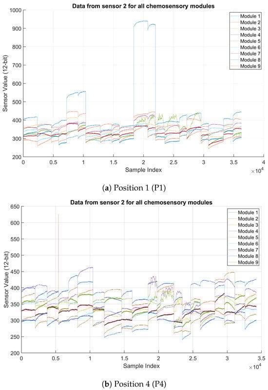 - Consistency Among the different modules: The graphs in Figure 3 represent data from Sensor 2 recorded across nine chemosensory modules (Module 1 to Module 9) at two positions, P1 and P4. Both locations exhibit distinct step-like changes in sensor readings over time, indicating abrupt shifts in gas concentrations. P4 displays higher variability and noise in sensor signals than P1, particularly in the mid-range values. Most modules have similar trends, responding similarly to gas concentration changes. This suggests that the sensor is generally reliable across different modules. Some modules (e.g., Module 8 in P4) show higher fluctuations, which may indicate sensitivity differences or noise issues. P4 appears to have more noise than P1, possibly due to environmental factors (e.g., turbulence or gas diffusion patterns).