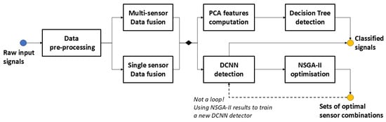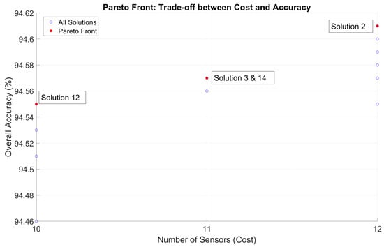The algorithm is run over several generations until convergence is reached, resulting in optimal solutions representing trade-offs between the number of sensors and detection accuracy. These solutions recommend sensor combinations that optimize the detection system’s cost and performance. - The Matlab 2023a implementation of the NSGA-II algorithm was used with a population size of 50, 100 generations, a crossover rate of 0.9, and a mutation rate of 0.05.