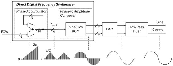Nowadays, a DDFS has become a very common digital block used in many designs. For example, in telecommunications, a DDFS is used broadly in wireless communications and software radio [2,3]. Also, in more modern networks, such as 5G, the DDFS has been a common research topic [4,5,6]. The improvements in DDFS technologies have enabled its use in several different applications in many diverse fields such as medical instruments, radars, and even with nuclear science in neutrino observatories [7,8,9,10]. Furthermore, the recent advancements in DDFS have enabled it to be used in several quantum technology fields, such as quantum communications, quantum computing, and quantum sensing. In quantum communications, the DDFS is used as it provides a versatile method for generating nearly any arbitrary combination of phase and frequency [11]. In modern-day quantum computers utilizing trapped-ion or spin qubits, the DDFS is used in the control electronics [12,13,14], and in quantum sensing, the DDFS has been applied for example in cold atom gravimeters [15]. These new emerging application fields have given rise to the development of new hardware designs to enable more efficient DDFS implementation. We will start by introducing the generic DDFS architecture.