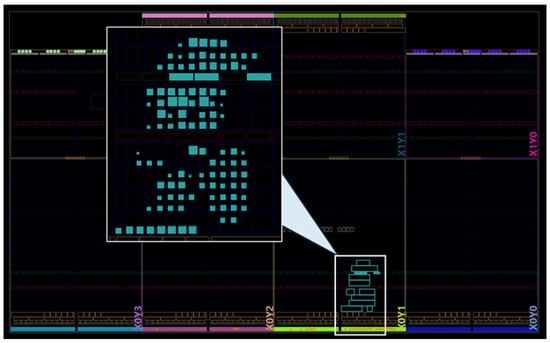 AMD Artix 7 FPGA layout image of the second-order Taylor series-based DDFS design. The blue rectangles in the enlargened image indicate different utilized logic blocks. The three DSP slices are clearly visible in the top part of the design.