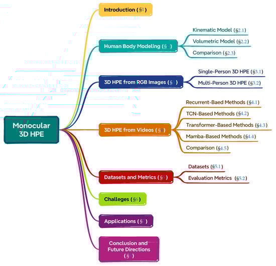 A summary of the structure of this article can be found in Figure 1. The remainder of this survey is structured as follows. Section 2 reviews human modeling techniques relevant to HPE. Section 3 and Section 4 provide detailed discussions on 3D HPE from RGB images and videos, respectively. Section 5 summarizes the commonly used datasets and evaluation metrics, while Section 6 delves into the existing challenges. Section 7 explores diverse application domains, and finally, Section 8 concludes the paper with insights on future research directions.